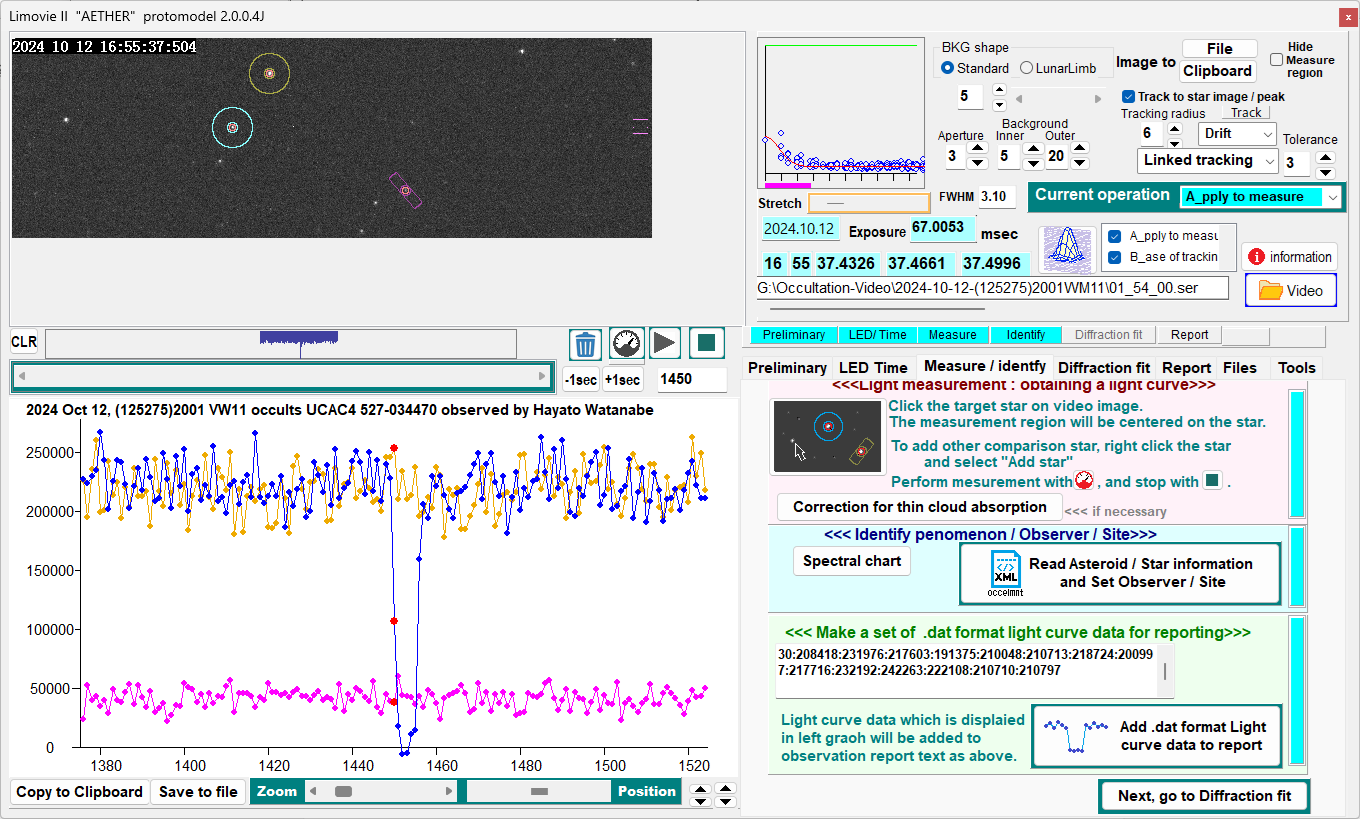 This software c.an perform a series of tasks: [1] measuring light curves from videos observing occultations, [2] determining the event time by comparing them with diffraction simulation curve, and [3] creating reports to send to IOTA/EA Regional Coordinators. Users do not need to save the results to some files and transfer them for other software during whole analysis.